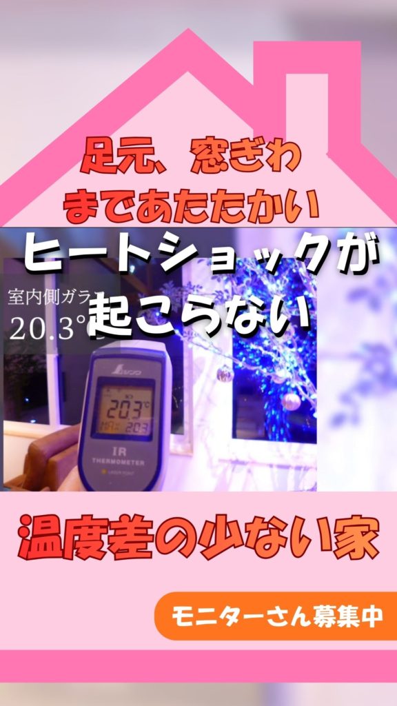 - ☆ 足元、窓ぎわでも暖かい。ヒートショックが起こらない家とは? ▶ショート動画で確認する (現在、モニターさんも募集中です。幸せな未来への第一歩に!)